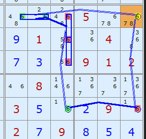 The equivalent Grouped X-Cycle based on candidate 6 gets many more eliminations since it's an off-chain continuous Nice Loop.