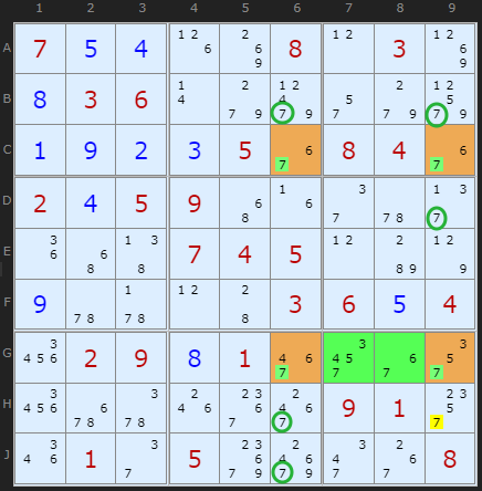 In the example, the 7 in J7 and J8 cannot be eliminated because it is possible that G6 contains a 7. If that's the case, then C9 does as well, but none of G7, G8, G9 or H9 do. That leaves only J7 and J8 as candidates for the 7 in box 9. Therefore, the 7 in J7 and J8 cannot be eliminated.