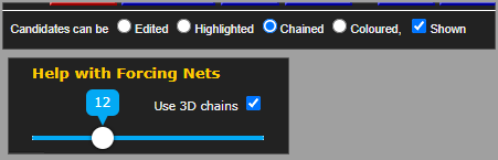 Well spotted and yes and no. Firstly I wanted an example that wasn't just a 'all candidates emptied a cell'. But also I wanted an intermediate example and yes 3D Medusa is a partial subset of Forcing Nets and we trace them in a similar way. But 3D Medusa is restricted to bi-value and bi-location links and we are going to go well beyond that. Interesting not every candidate in the example will find a contradiction and when it does it might be in a different part of the pattern. We are allowed to try out different 3D Medusa patterns in the same space with this feature. Try clicking on 1 in C2.