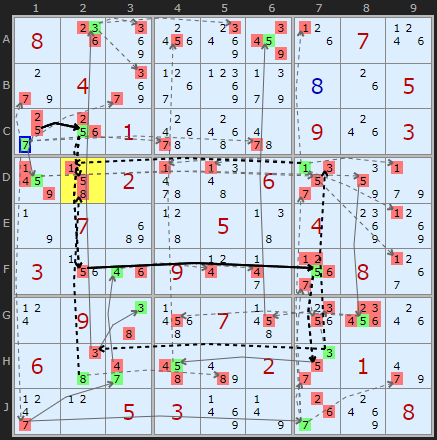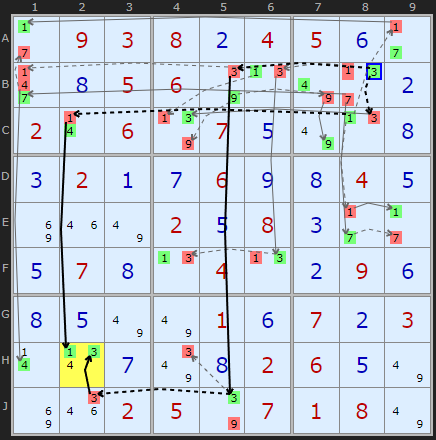 The second reason I've been hesitant to introduce them is they are border-line "trial and error" and my solver is devoted to "pattern-based" strategies. I don't believe in back tracking as a final resort. It is more interesting to leave those puzzles as an open question. However it is possible to reduce a Forcing Net to the essential chain fragments and express them as Alternating Inference Chains.