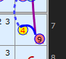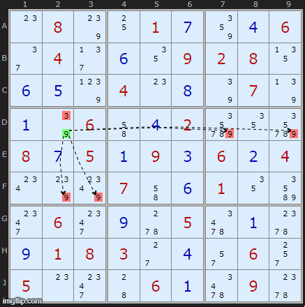 Grouped cells also play a part in Forcing Nets just as they do in Forcing Chains. This illustration on a net fragment shows how the initial placement of 9 in D2 removes the 9s from the rest of box 4. The simulator detects there is only one 9 left in the row and adds it to the net to allow the net to continue growing. This example is in a relatively simple puzzle that doesn't need a Forcing Net but I teased it out as a clear example. Unlike the AICs draw on the board I don't add a box and just draw arrow from one of grouped cells to the next part of the link.