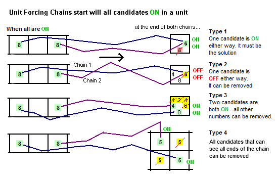These are the different types of eliminations available from Unit Forcing Chains. The diagram shows part of a row with two candidates but the same types and principles apply to units with three (Triple) or four (Quad) candidates - just add more chains